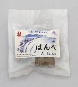 「黒はんぺん」は元来、「はんべ」と呼ばれていました。小泉八雲が心の避暑地として6度も焼津を訪れ、過ごした明治の時代の素材を使って再現した、昔ながらの「はんべ」です。商品名を八雲の名著である「At Yaidzu」からいただき、パッケージ裏面のQRコードから、焼津の海と音楽と共に、懐かしい味をお楽しみいただけます。