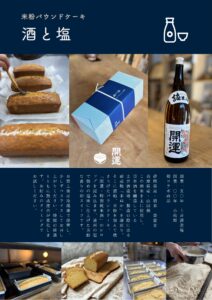 (1) 赤糠・酒粕を使った独自の製法によるパウンドケーキの開発。本商品では小麦を使わず、赤糠・酒粕・米粉を使用し配合の順序・レシピもオリジナルである。また、香りづけもブランデーではなく、日本酒を使用する。