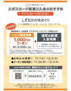 またエポスカード新規入会で通常特典の2,000円クーポンに加えて、本物産展で使用出来る1,000円分のクーポンの獲得が出来ます。ご興味ある方は詳細を別添チラシにてご確認いただき、本物産の紹介コードをご記入のうえご登録ください。